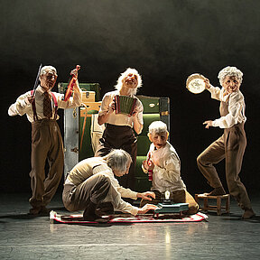 Fröhlich und ein wenig ungelenk tanzen die alten Menschen, wie Bauern vom Land sehen sie aus in ihren Westen und Hosenträgern. Sie tragen große Maskenköpfe: Sofia Nappis Stück irritiert durch den Gegensatz zwischen den runzelig-gütigen Gesichtern und der erstaunlichen Beweglichkeit ihrer Träger. Warum fühlen wir uns manchmal wie Puppen in unserem eigenen Leben? In »IMA« geht es um die Masken, hinter denen unsere Gefühle verkümmern, es geht um das Gepäck, das wir mit uns herumschleppen, das wir wie in einem Ritual immer wieder aufs Neue auspacken und sortieren.