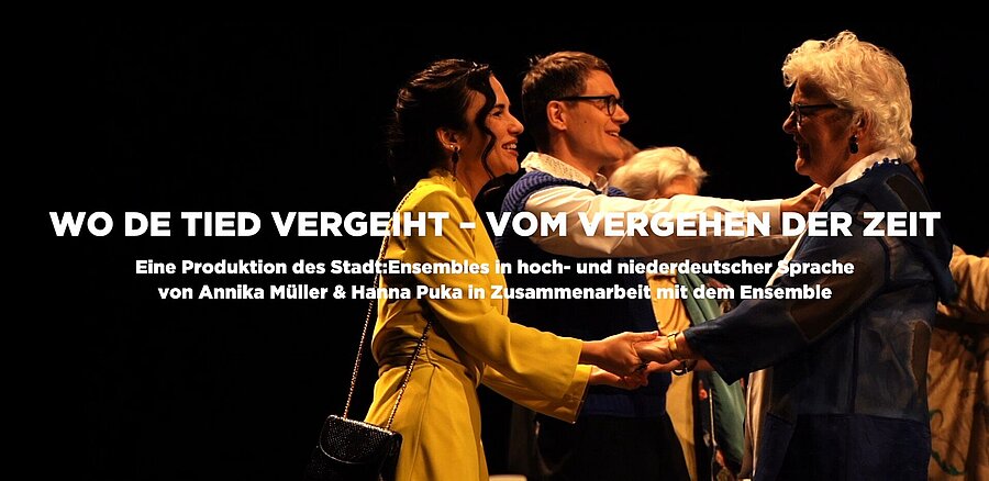 In dem Schauspiel mit musikalischen Einlagen »Wo de Tied vergeiht – Vom Vergehen der Zeit« stehen 15 Menschen unterschiedlicher Generationen, geboren zwischen 1947 und 2007, die in und um Oldenburg leben, gemeinsam auf der Bühne, um ihre Geschichten zu erzählen. Sie erinnern sich, blicken zurück und in die Zukunft und fragen: Was will ich mit meiner eigenen Zeit anfangen? In der Stückentwicklung verhandelt das Stadt:Ensemble ganz persönliche Lebensfragen, Schicksalsschläge und Sternstunden und macht dabei die alltägliche Parallelität verschiedenster Lebensgeschichten, die sich zeitgleich auf der Welt und in Oldenburg abspielen, sichtbar.
