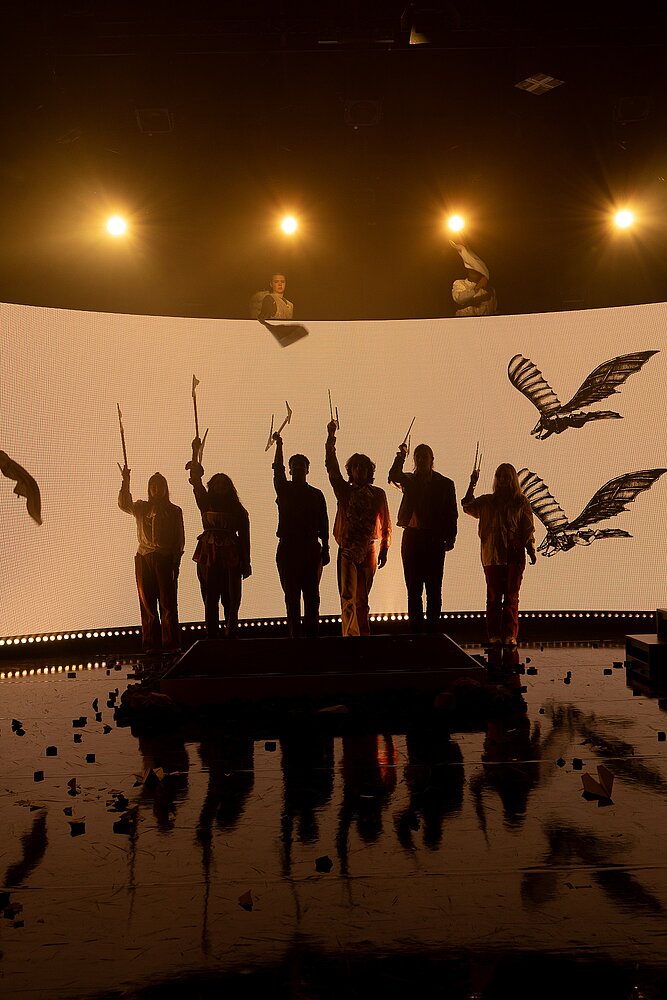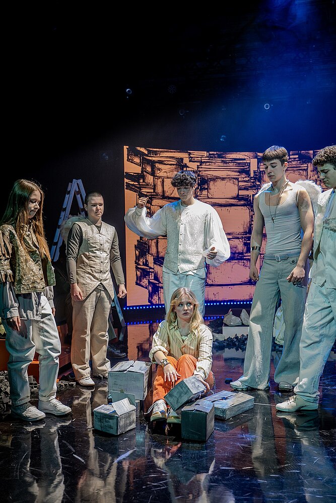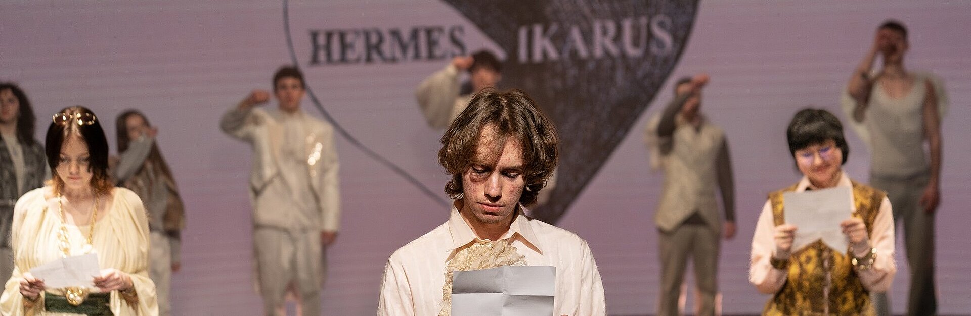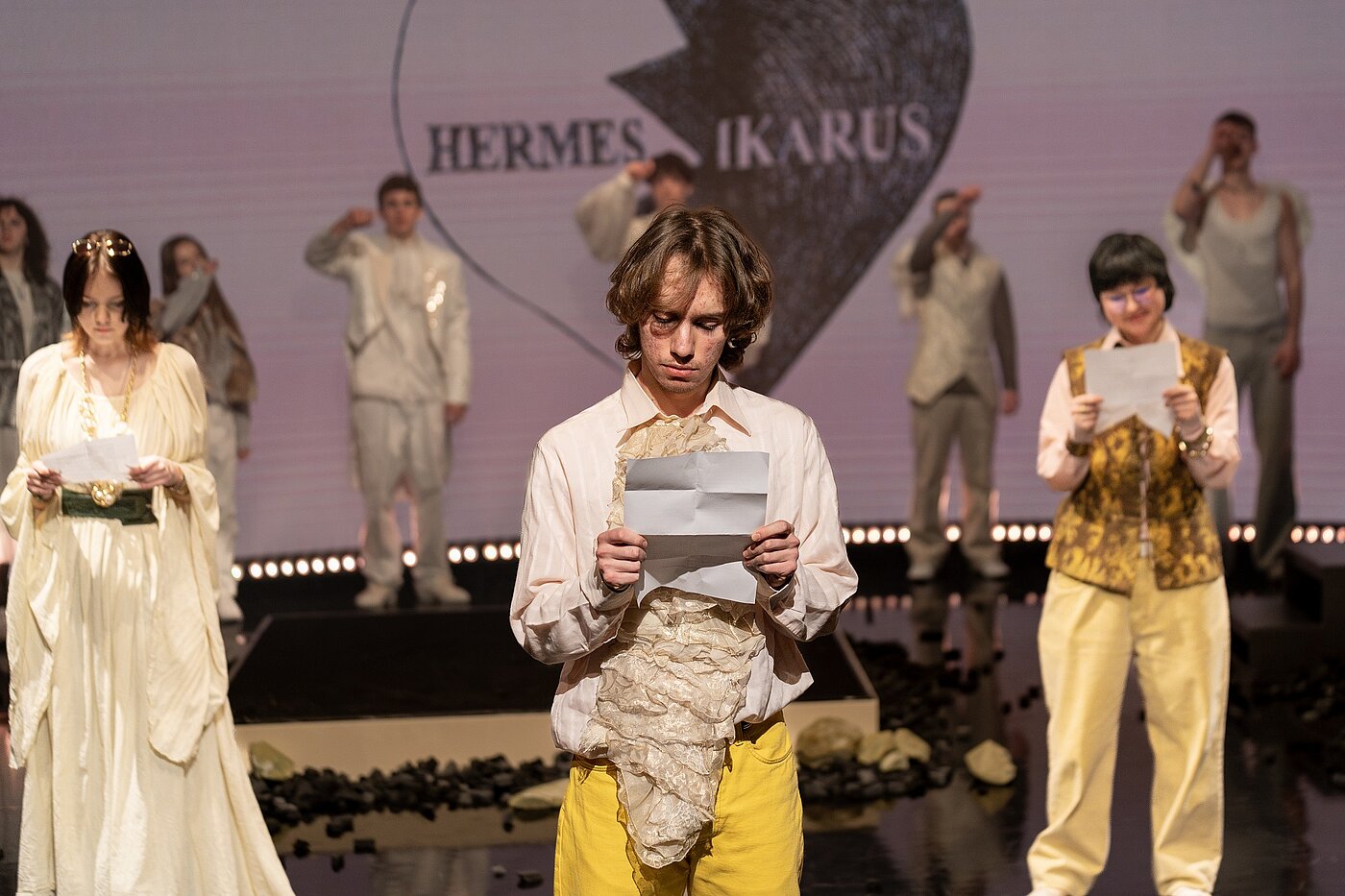 20 junge Erwachsene der BBS Haarentor und des Bildungszentrums für Technik und Gestaltung zeigen Momente des Erwachsenwerdens. Dabei werfen sie einen Blick in die Antike: Der Vater-Sohn-Konflikt aus der Sage von Dädalos und Ikaros wird in die Luft gewirbelt. Der Götterbote Hermes tritt in vielfältiger Gestalt auf und liefert jede Menge nicht bestellter Pakete. »Tschüss Kindheit« sagen sie und stoßen sich vom grauen Stein ab. Sie beginnen mit unbekannten Flügeln zu schlagen: Richtung Sonne, immer weiter, immer höher. Ein Absturz scheint nicht unwahrscheinlich, doch viel größer als die Angst ist die Lust auf Sonne im Leben und einen weiten Horizont.